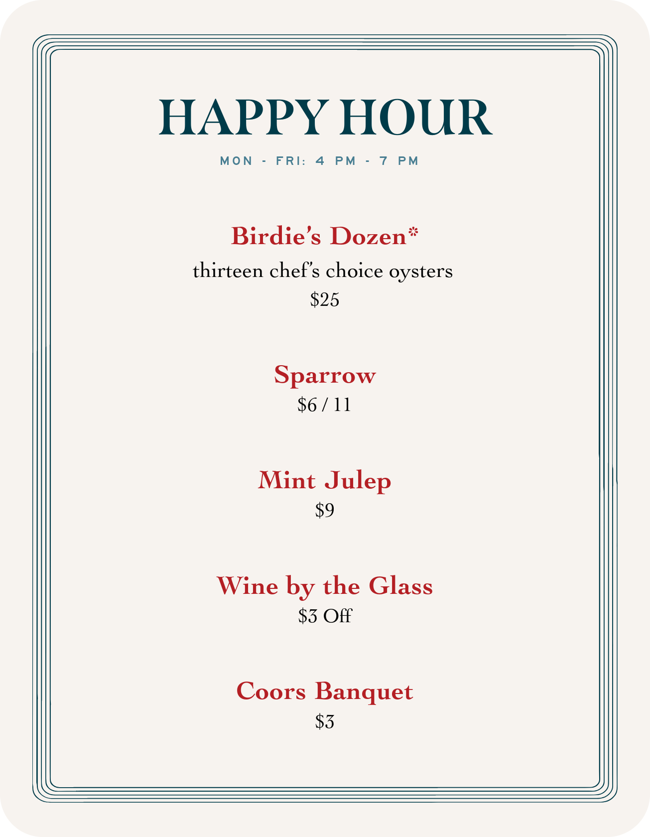We’re known for our craft cocktails, East Coast oysters, homemade pastries, and shareable plates.